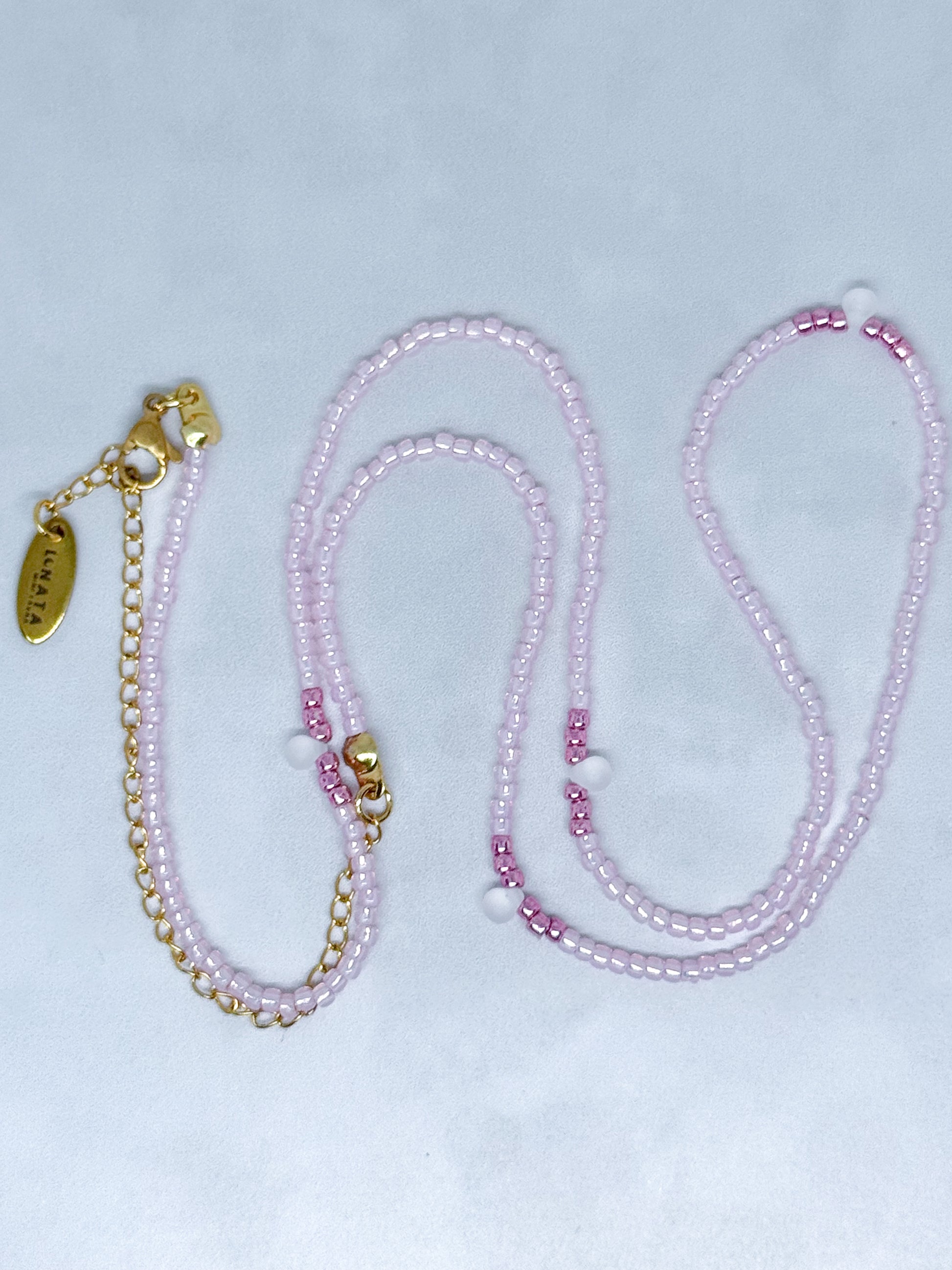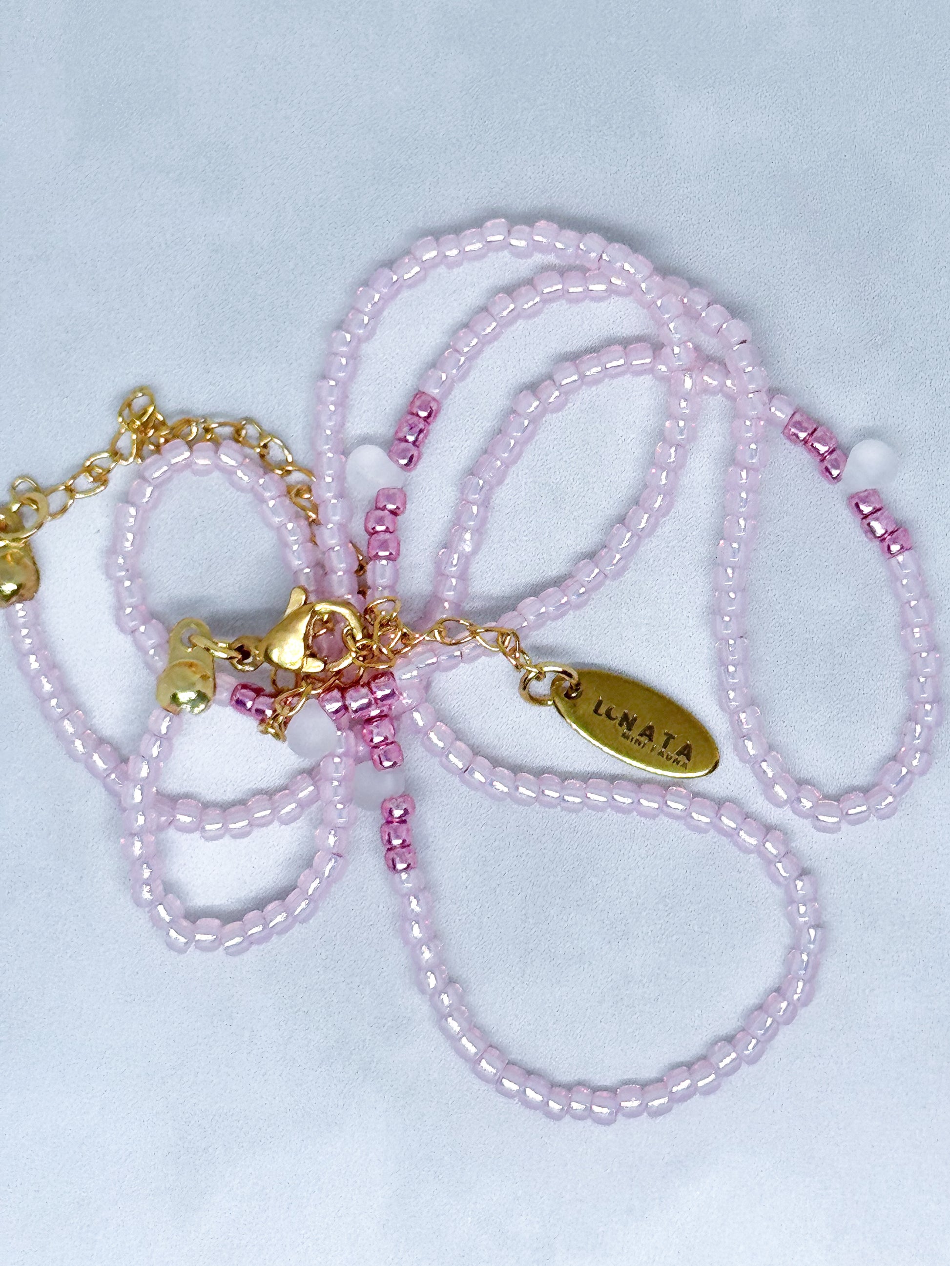 Rosa metálico tenue, con base de rosa pastel translúcido. Acompañado de una cuenta blanca esmerilada cristal.